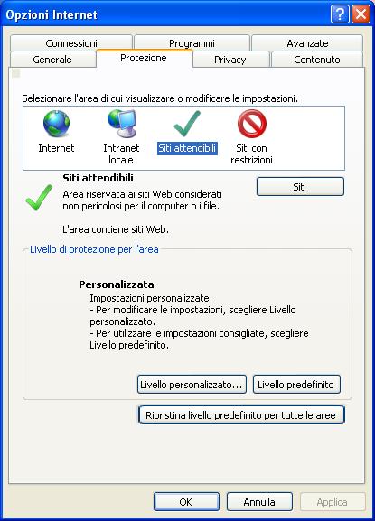 2- Selezionare 'Protezione' e poi 'Siti Attendibili'