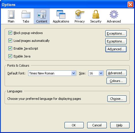 2- Selezionare 'Content' ed assicurarsi di aver abilitato la voce 'Enable Javascript'